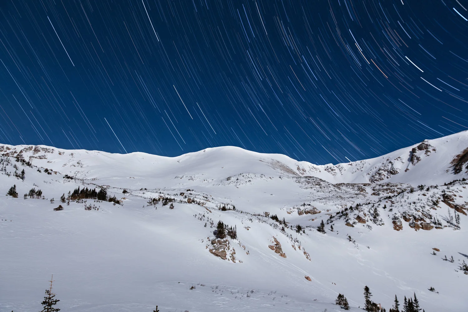 The scenic views by the Arapaho Lakes are buried by feet of snow in January, but the mountains make a great destination for backcountry skiing. Most treat the trails as a day trip destination from the Front Range, but a few friends decided to camp out in a snow cave. Emergency shovels were put to work, and a temporary accommodation for five was carved out of the snowpack. Battery-powered lights were a great last minute addition to the cave. While I was warm inside, the camera clicked away as the stars tracked across the sky above moonlit mountains.